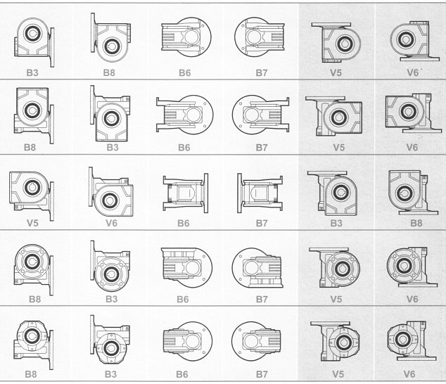 Unsere Schneckengetriebe sind mit permanenter und wartungsfreier Schmierung ausgestattet. Erlaubt sind alle hell dargestellten Montagearten. Hier grau dargestellten, senkrechten Montagearten mit dem Motorflansch nach oben oder unten sind hingegen nicht möglich. |